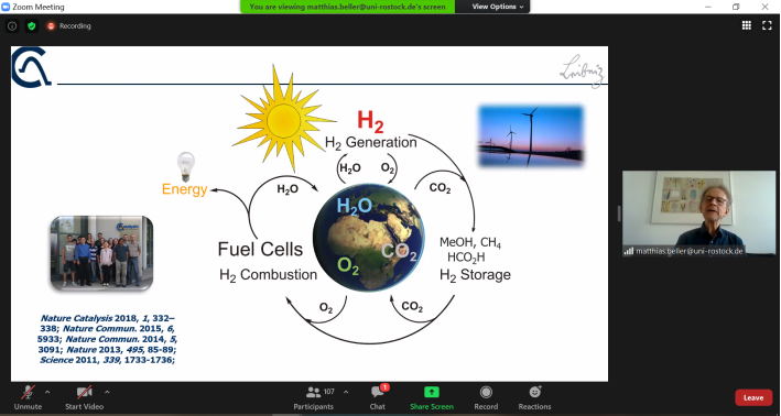 英国伯明翰大学能源研究院院长Martin Freer教授、阿联酋哈利法大学副校长Steve Griffiths教授、德国罗斯托克大学莱布尼茨催化研究所所长Matthias Beller教授、马来西亚国油大学生物燃料和生化研究中心负责人Suzana Yusup教授、俄罗斯南乌拉尔国立大学可替代能源国际科研项目组负责人Evgeny Solomin教授、英国伯明翰大学燃料电池与氢能研究中心Ahmad El-Kharouf博士、华北电力大学能源与动力工程学院院长杜小泽教授等先后作主旨报告。专家们分析了当下氢能发展的机遇与挑战,以及在工业领域脱碳运动中的应用前景;介绍了催化剂在氢燃料存储中的重要作用,生物质热化学转化制氢、碳基储能材料、氢基燃料等的最新研究进展;探讨了以氢能为动力的可再生能源计划;展望了氢能发展助推中国2060碳中和的愿景。会上,参会者与发言嘉宾积极互动交流,为进一步拓展高校间氢能国际合作提供了良好的契机。