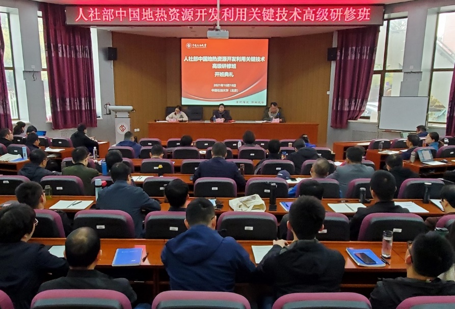 2021年10月18日,中国石油大学(北京)网络与继续教育学院承办的“人社部中国地热资源开发利用关键技术高级研修班”在东校园培训基地第一报告厅隆重开班,人社部事业单位人事服务中心继续教育和国际合作处处长徐梅,中国石油大学(北京)网络与继续教育学院副院长李水出席开班典礼并讲话,开班典礼由中国石油大学(北京)网络与继续教育学院高端培训中心吴希主持。