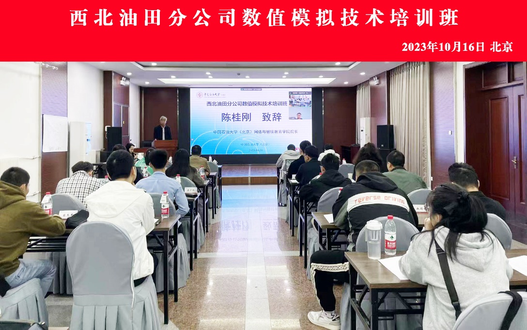 2023年10月16日上午,由中国石油大学(北京)承办的西北油田分公司数值模拟技术培训班顺利开班。来自西北油田分公司的20名油藏技术骨干参训。网络与继续教育学院院长陈桂刚、西北油田分公司高级专家刘学利出席了开班典礼。