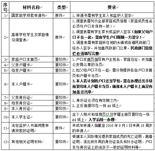 2016年校园地国家助学贷款申请材料及要求